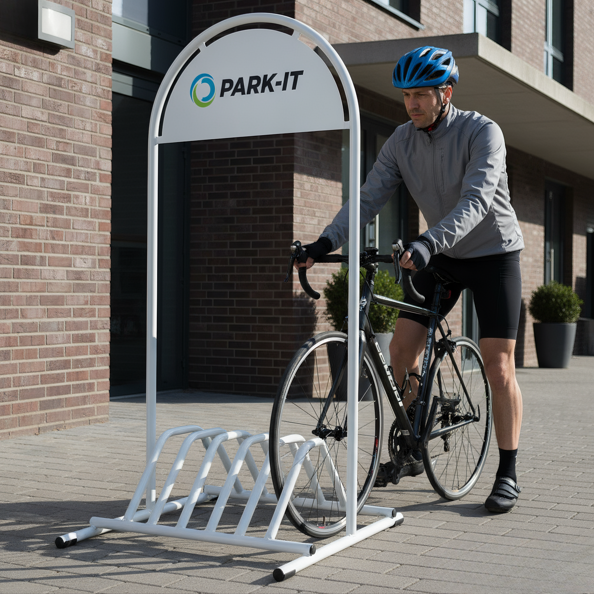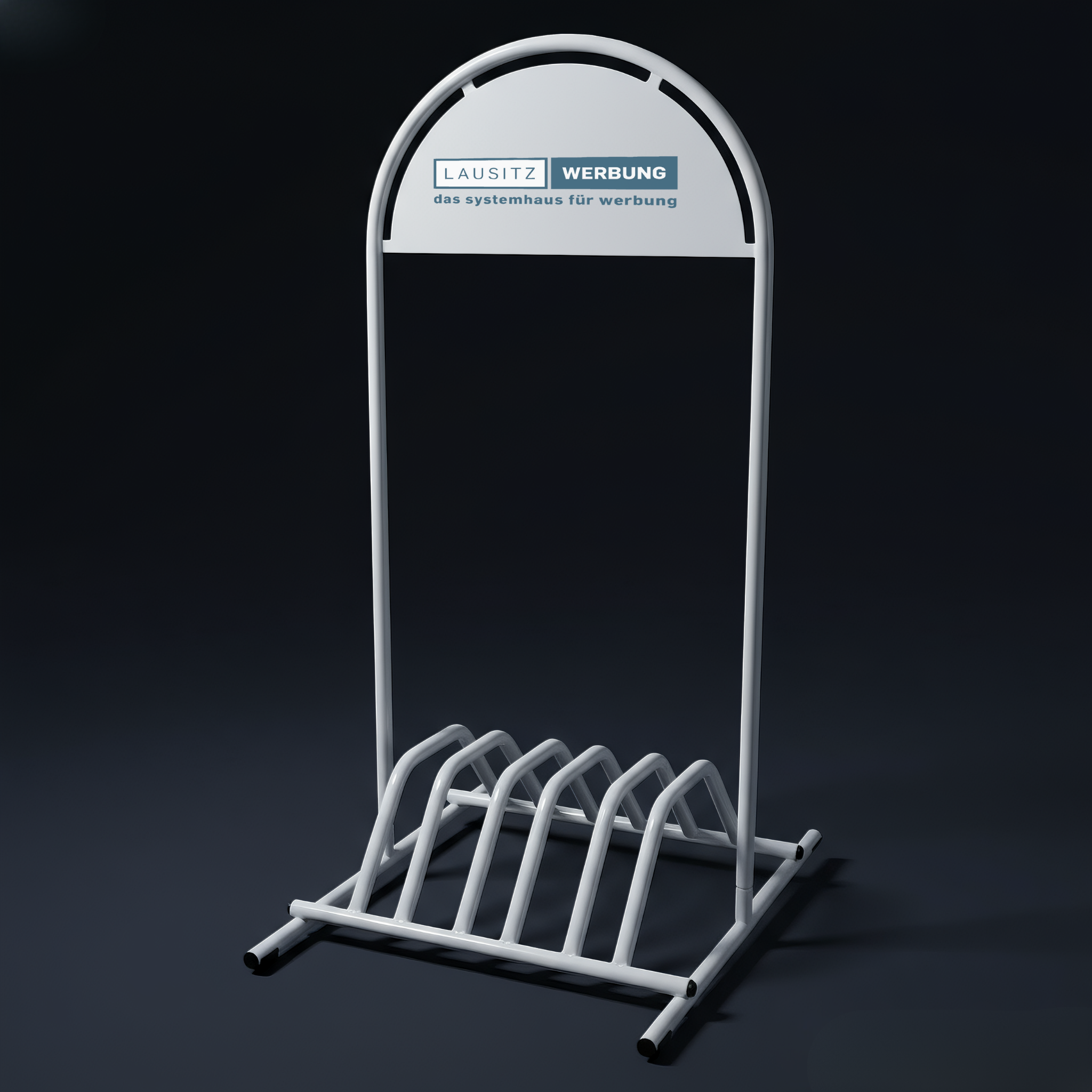 Produktinformationen "Kundenstopper mit Fahrradabstellplatz und Logo-Schild – in Silber oder Weiß, inkl. Druck"